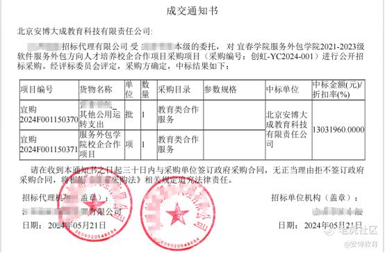2024年5月21日,宜春学院服务外包学院2021-2023级软件服务外包方向人才培养校企合作项目采购项目委托代理公司就招标结果进行公布,安博教育科技集团旗下机构北京安博大成教育科技有限责任公司凭借深耕教育服务行业多年的综合实力、优质的行业口碑、完善的商务方案成功中标,中标(成交)金额13031960.0000元。