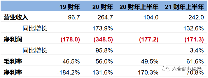 公司收入连续翻番以上增长,目前仍处于亏损状态。公司2019~2020财年(公司财年为上年2月~当年1月)、2021财年上半年(2020年2~7月),收入分别为0.97亿美元、2.65亿美元(+173.9%)、2.42亿美元(+132.6%);净利润分别为-1.78亿美元、-3.49亿美元(-95.8%)、-1.71亿美元(+3.4%);毛利率分别为46.5%、56.0%、61.6%;净利率分别为-184.2%、-131.6%、-70.8%。