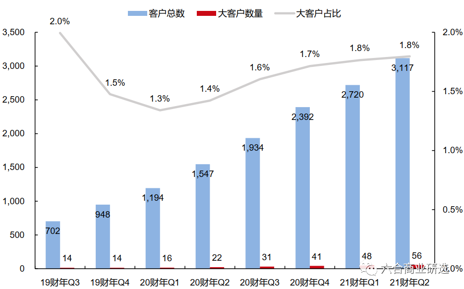 注:公司财年为上年2月~当年1月;Q1~Q4分别为第一~第四财季,分别对应上年2月~上年4月、上年5月~上年7月、上年8月~上年10月、上年11月~当年1月;大客户指过去12个月支付产品费用超100万美元的客户。