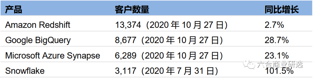 注:Amazon Redshift、Google BigQuery、Microsoft Azure Synapse客户数量来自HG Insights官网,为截至2020年10月27日HG Insights跟踪的使用该三个产品的公司数量;Snowflake客户数量来自公司公告,为截至2020年7月31日数据。