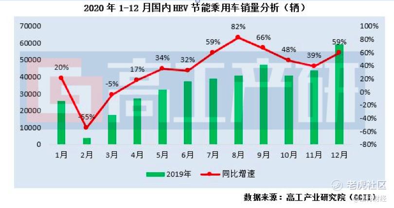 根据高工产业研究院(GGII)发布的《中国HEV&48V节能乘用车月度销量数据库》统计,刚刚过去的2020年,我们HEV型节能车型乘用车销量合计41.4万辆,同比增长40%,在12月更是达到了同比增加59%的增幅。