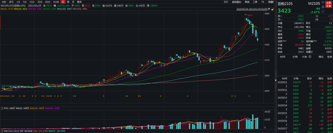 但是,从上周开始,美豆和连粕价格双双开始下跌。一方面,前期获利的多头资金纷纷开始平仓离场,主要因为前期多头上攻较为猛烈,近期国内疫情的不确定性引发担忧,多头恐高寻求落袋为安。