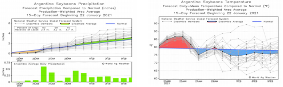 巴西方面,据13位分析师参与的调查显示,尽管干旱推迟了大豆播种,但巴西农民有望在2021年收获创纪录的1.322亿吨大豆。此外,有分析师称,12月和1月的降雨能够缓解巴西大豆生长初期雨水不足的状况。所以,从目前的天气情况和市场预期数据来看,巴西大豆产量可能不会出现明显损失。
