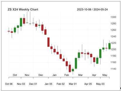 市场正努力提高小麦和玉米的价差,来配给全球 1000 万 - 1200 万公吨的需求。预计小麦饲料用量会在2024/2025 年度减少,而玉米饲料用量则可能增加。今年收获后的恢复将取决于需求能否从其他地区转向美国,且7 月价格可能因收获而表现疲软。美国种植进度正常且中西部地区没有出现干旱情况,受此影响,CBOT 玉米期货在周五跌至图表支撑位。