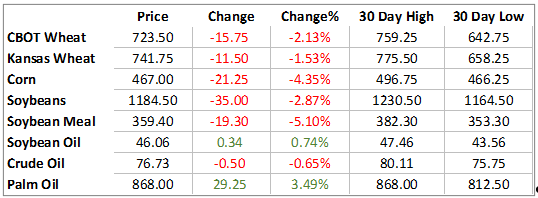 上周,在各种因素的影响下,价格呈下跌趋势。小麦价格因硬红冬小麦 (HRW) 作物前景改善而下跌,而玉米和大豆也出现下跌,这主要是因为种植进度好于预期。