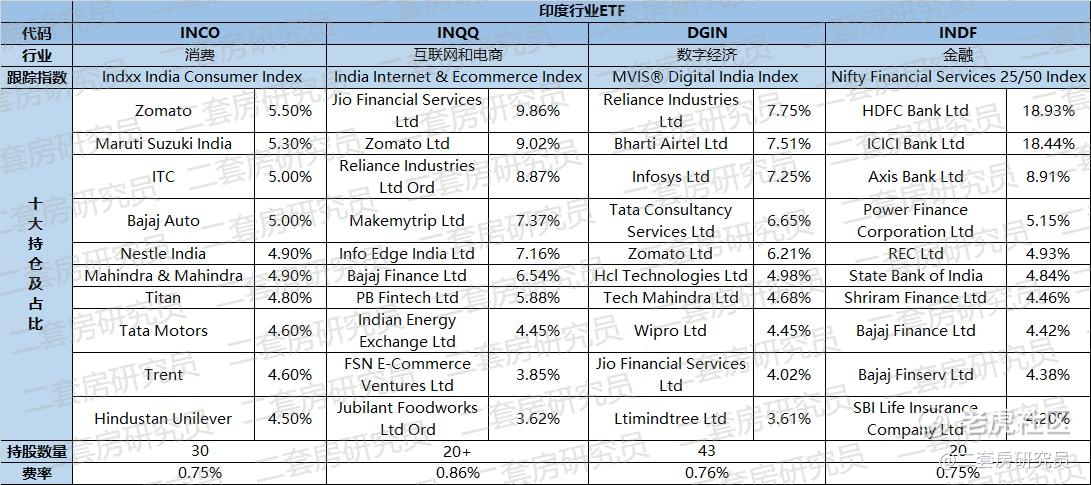互联网和电商:India Internet & Ecommerce ETF (INQQ)跟踪印度互联网和电子商务指数,成分股有20多家,来自但不限于互联网服务、互联网零售、互联网广播、互联网媒体、在线广告、在线旅游、在线游戏、搜索引擎、社交网络等行业。
