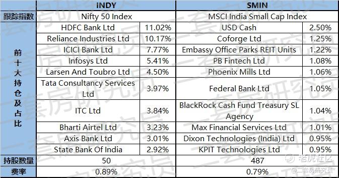 费率方面,INDY稍高为0.89%,SMIN为0.79%。