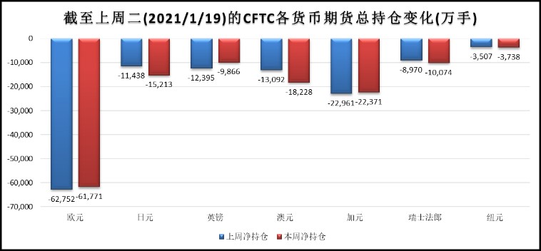据美国商品期货委员会公布的2021/1/19期货市场头寸持仓报告显示,上周各货币的报告总持仓情况如下: 欧元净多头变化981万手,日元净空头变化3775万手,英镑净多头变化2529万手,澳元净空头变化5136万手,加元净多头变化590万手,瑞士法郎净空头变化1104万手,纽元净空头变化231万手,上周没有总持仓多空转换的货币。除此之外,单向总持仓变动超过20%的货币有:日元,英镑,澳元。