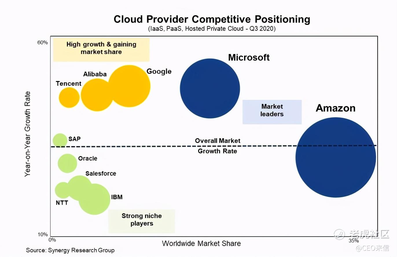 据调研机构Synergy Research的数据显示,截至2020年年中,亚马逊控制了全球云基础设施服务市场的33%,其次是微软(18%)和谷歌(9%),第四名就是中国的云服务公司阿里云。安迪也曾在2018年说阿里云是亚马逊唯一忌惮的中国云服务企业。