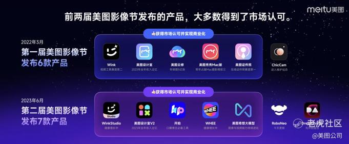 过去两届美图影像节,美图发布的AI产品已得到用户和市场的认可,多次登顶日本、韩国、泰国、越南等国App Store总榜第一。此外,美图设计室全年收入过亿,Wink是视频工具赛道第二名,美图证件照是在线证件照赛道第一名,开拍是口播创作工具赛道第一名。