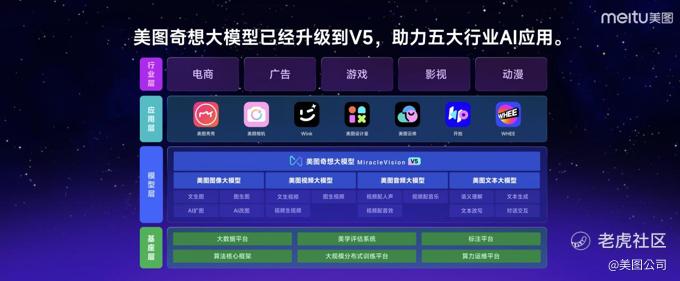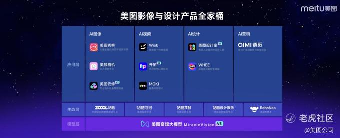 6款产品的发布进一步完善美图的AI产品生态。目前,美图的应用层有AI图像、AI视频、AI设计、AI营销四大模块,生态层由中国领先的视觉创意平台站酷和美图AI助手RoboNeo提供服务,模型层由美图奇想大模型(MiracleVision)为全系产品提供AI模型能力。