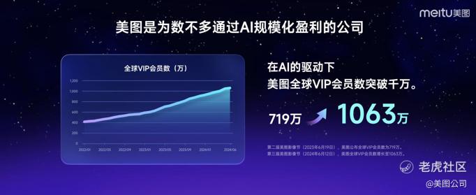 以AI工作流助力行业和用户提效的同时,美图公司全球VIP会员数创下历史新高,截至6月11日,美图全球VIP会员数为1063万。