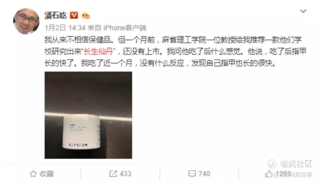 2019年,又一商界大佬潘石屹在微博上表示,"……我吃了麻省理工教授研制出来的"长生仙丹"近一个月,发现自己指甲也长得很快。"