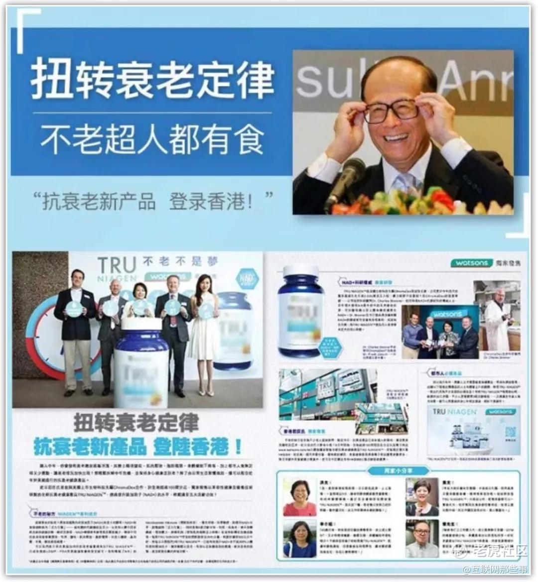 2017年9月中旬,一款名为TRU Niagen的"不老药"公然上架了李嘉诚位于香港的100多家屈臣氏连锁,甚至宣传物料上都随处可见李嘉诚力挺背书的身影。