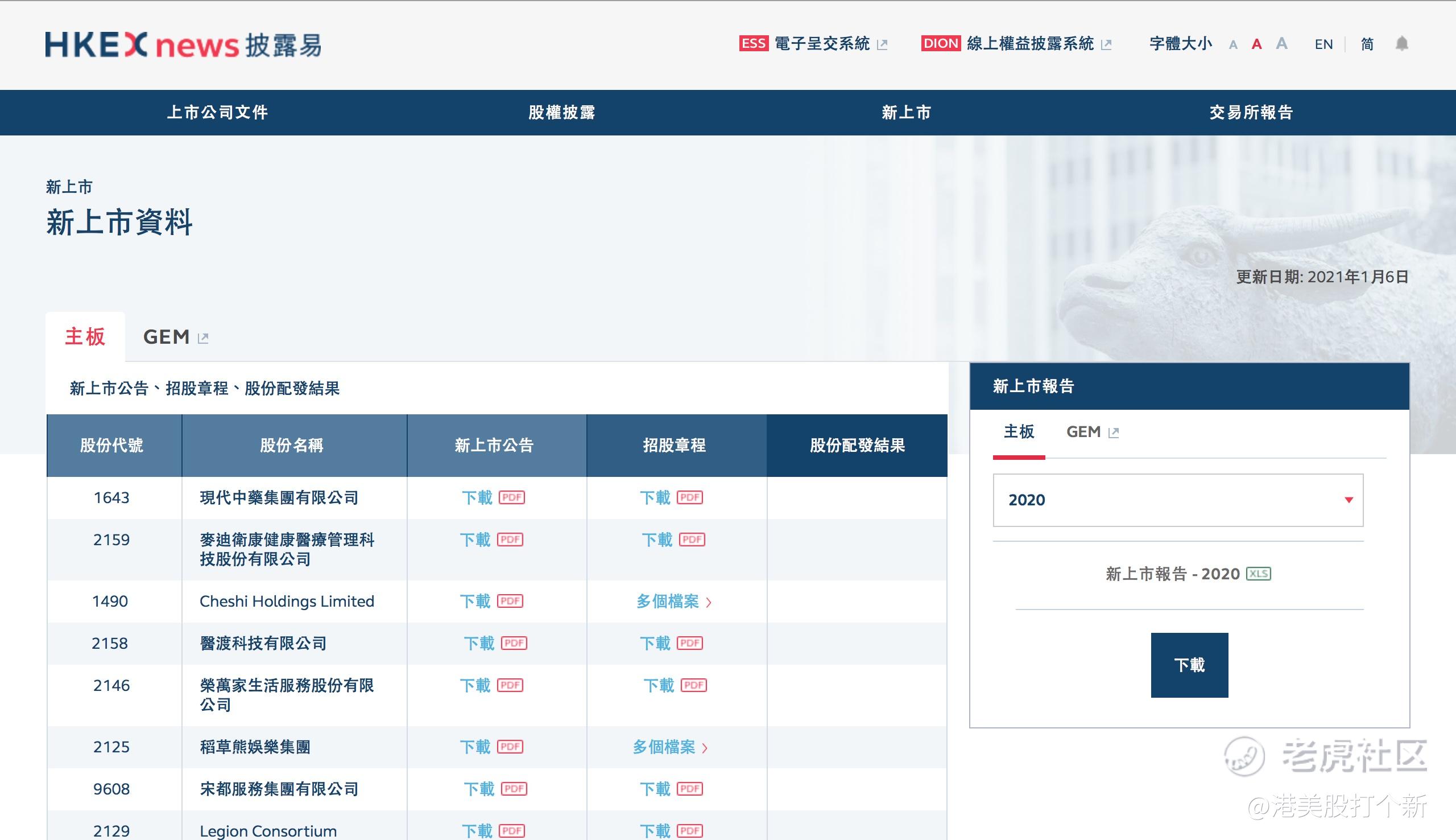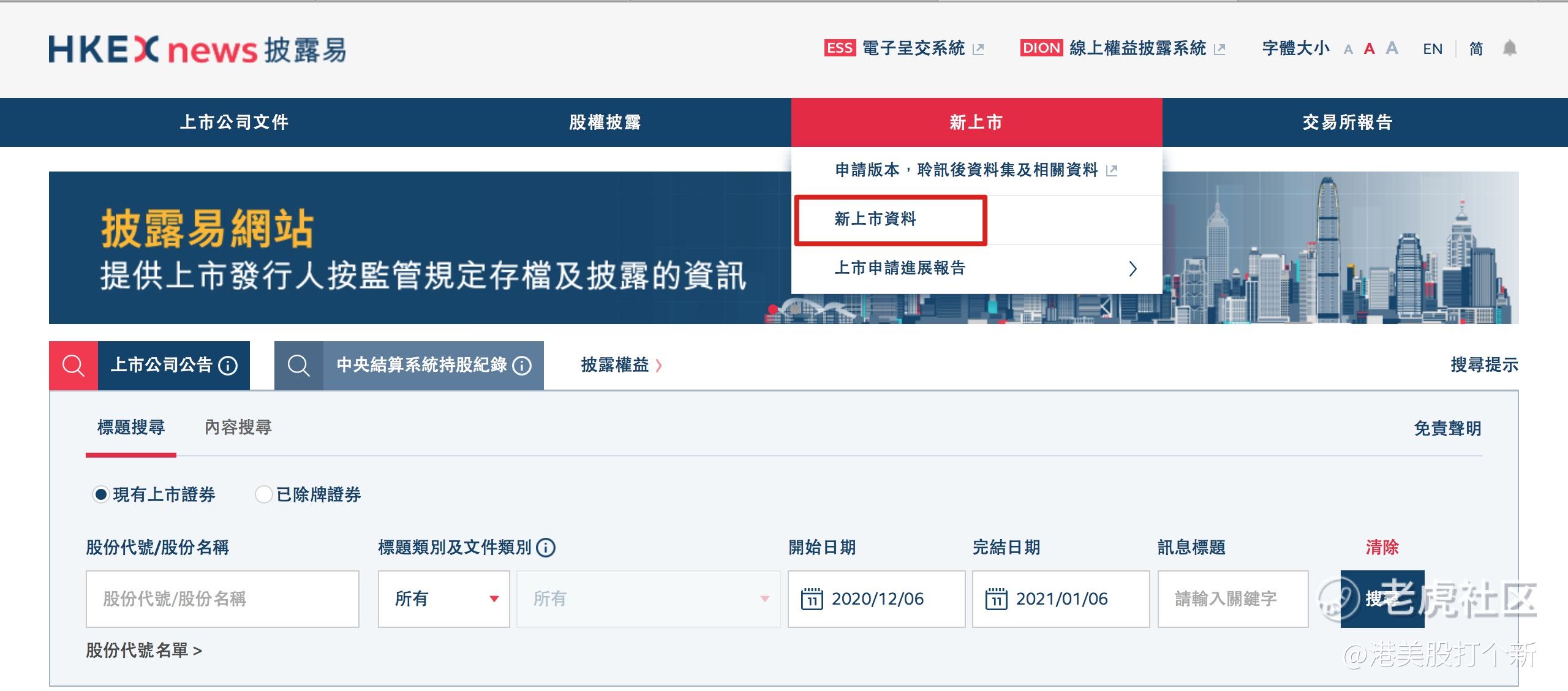 第一步,我们首先打开披露易的官网,点击上方导航栏的【新上市】中的【新上市资料】,我们就可以看到即将上市的新股了。