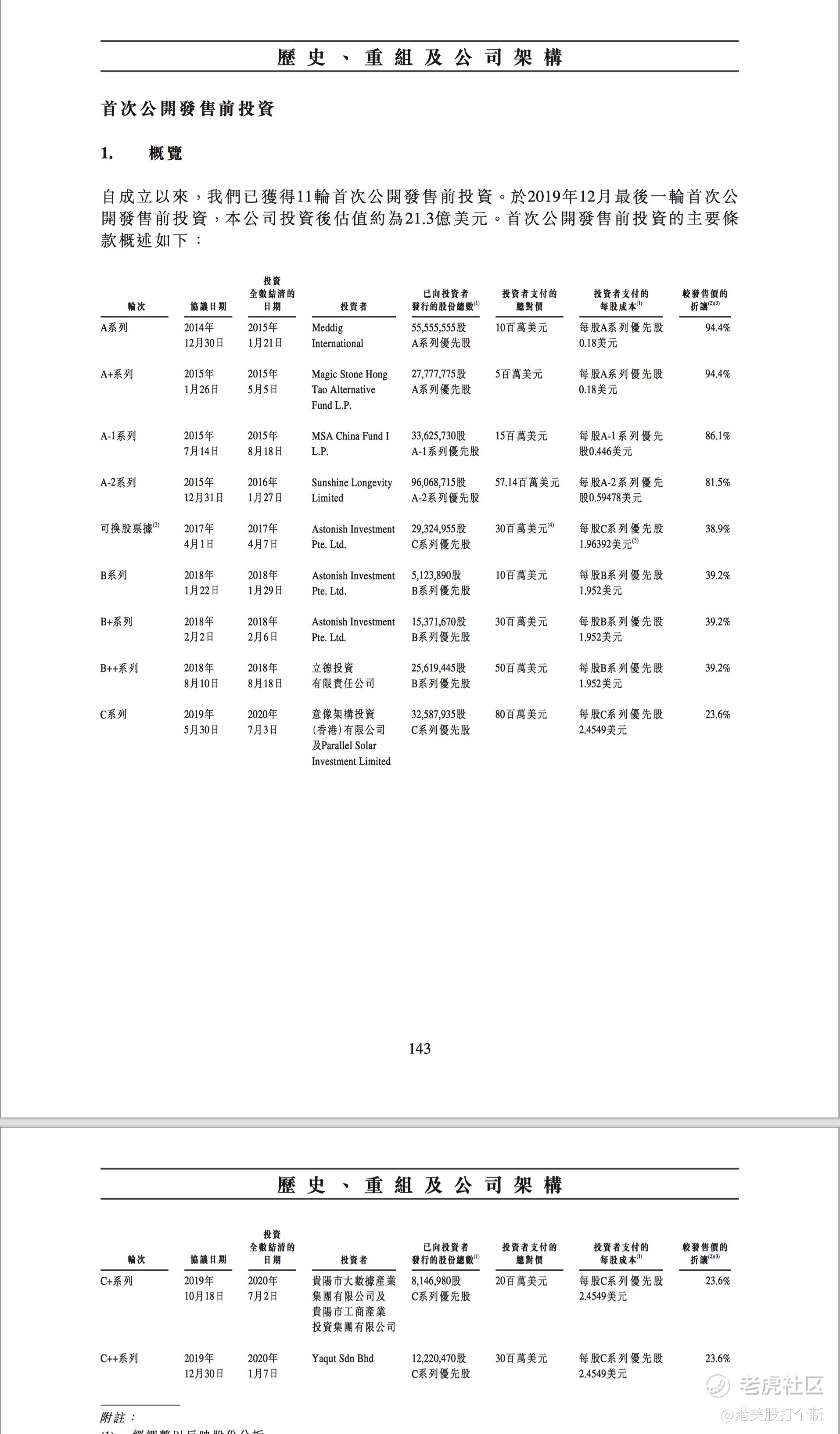 在“历史、重组及公司架构”这一章节,我们可以看到Pre-IPO投资者的情况。