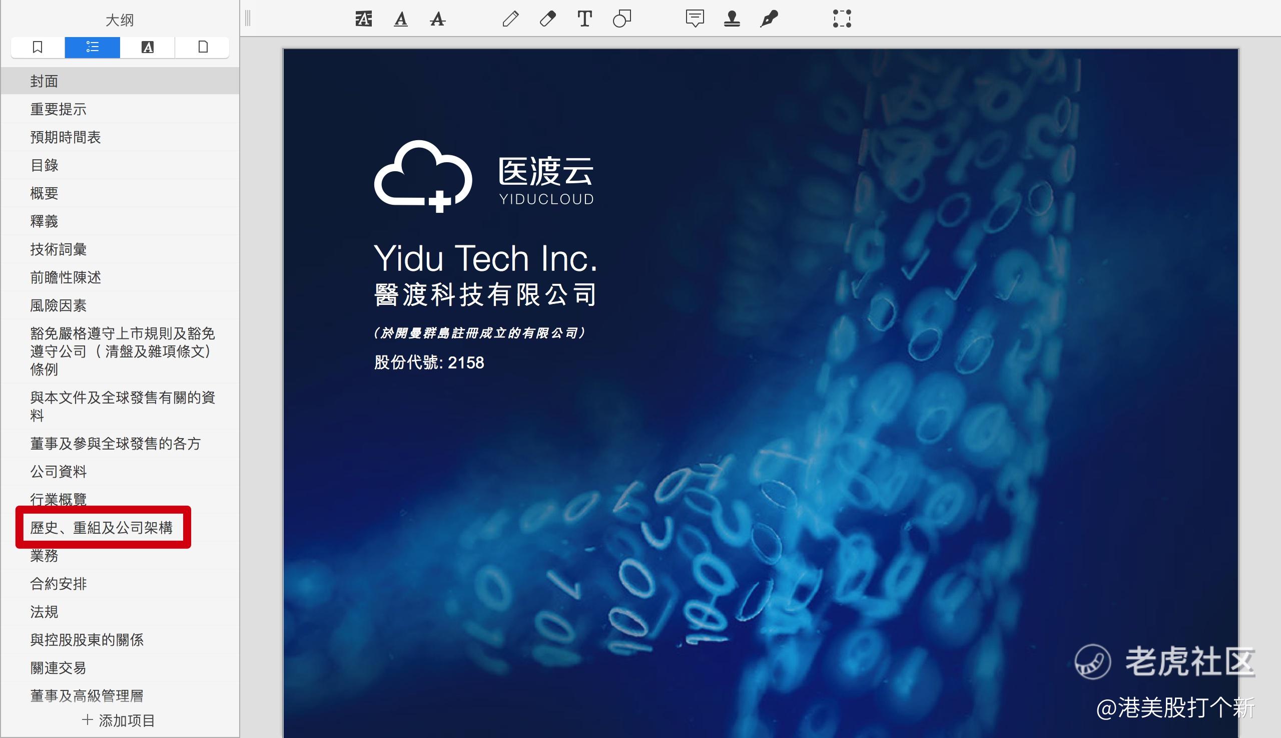 我们打开医渡科技pdf文档,首先看招股说明书的目录,在目录里面找到“历史、重组及公司架构”,然后点击进入这一章节。
