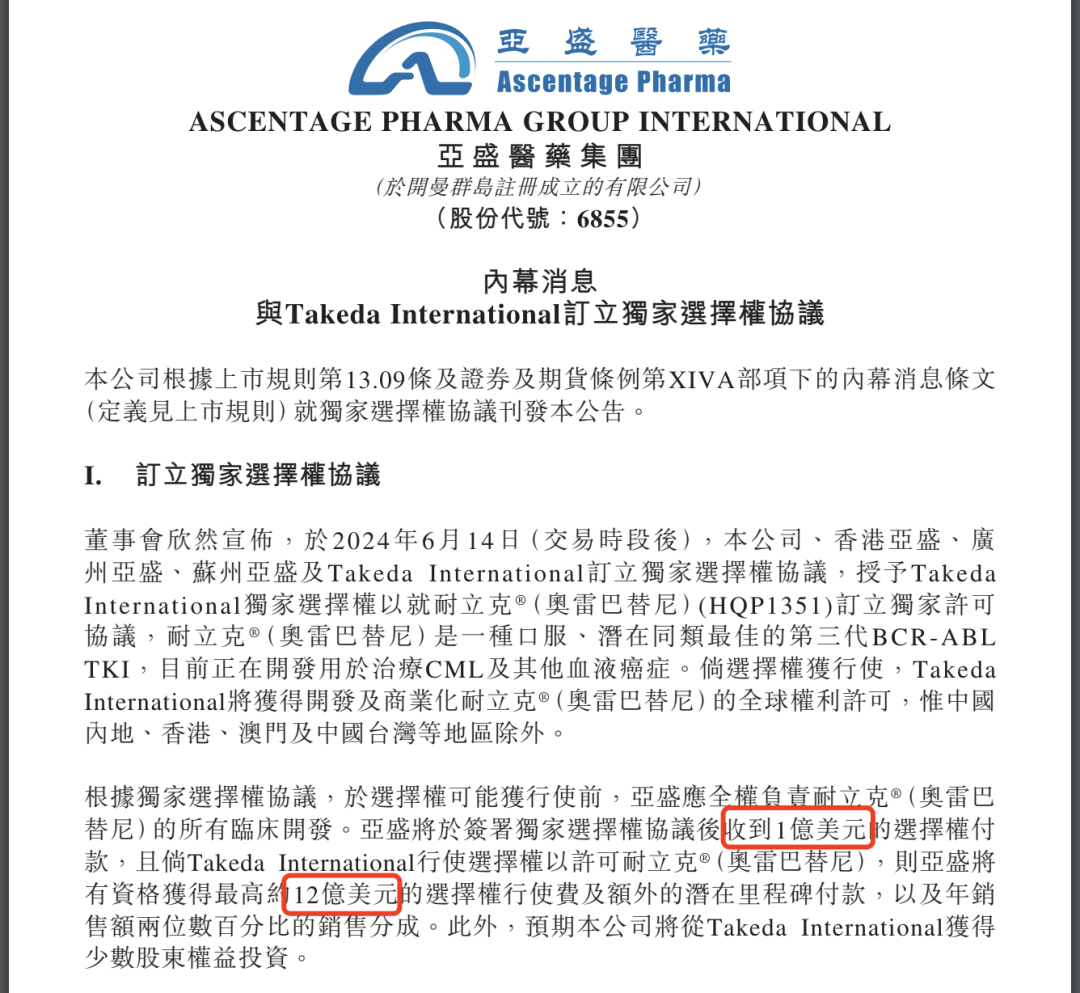 1、将其核心产品原创1类新药BCR-ABL抑制剂耐立克(奥雷巴替尼)大中华区之外的独家选择权许可给武田制药,获得1亿美元首付款,以及12亿美元的后期分阶段里程碑付款,外加上年销售额两位数百分比的销售分成。