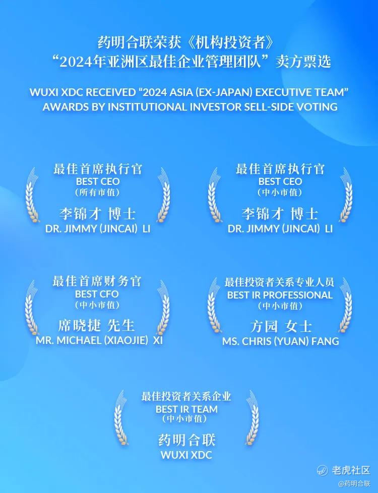 全球领先的生物偶联药合同研究、开发和生产企业(CRDMO)药明合联(WuXi XDC, 2268.HK)宣布,公司在国际权威金融杂志《机构投资者》(Institutional Investor)“2024年度亚洲地区(不含日本)公司最佳管理团队”评选中荣获多个不同投票类型的荣誉奖项,包括:“最佳首席执行官”、“最佳首席财务官”、“最佳投资者关系专业人员”和“最佳投资者关系企业”。此次为药明合联于2023年11月登陆港交所后的首次参选,本次获奖彰显了国际资本市场对药明合联的高度认可,极大地肯定了公司管理层和公司投资者关系管理的卓越表现。