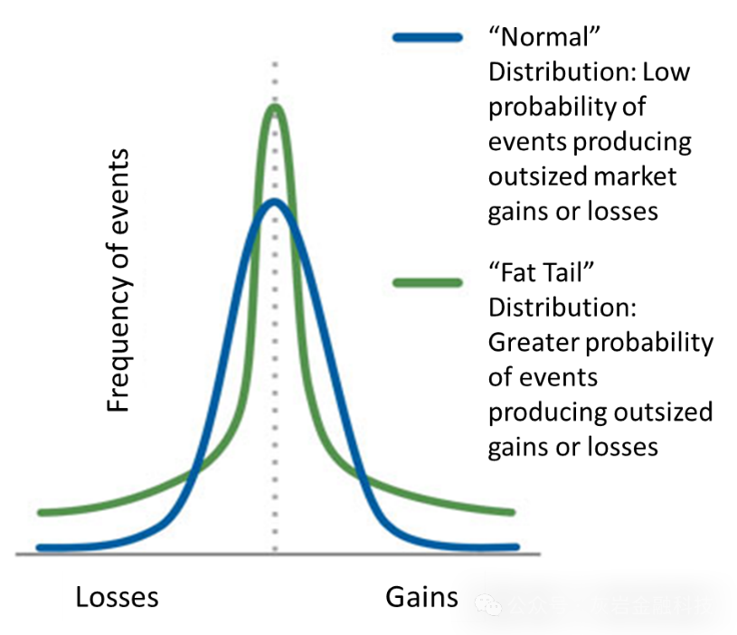 3. 肥尾分布(Fat-tailed distribution):又称super-heavy-tailed distribution。分布的尾部非常缓慢下降,极端事件的概率远大于正态分布。这表示极端事件几乎是常态,极端价格波动更为显著。