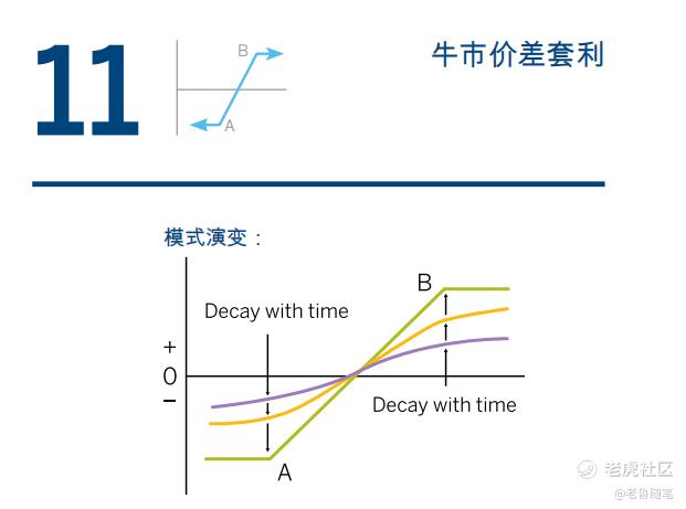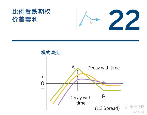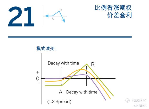 获利特点:无论任何方向,获利均无限制。到期时,收支平衡点为 A 加上或减去价差套利成本。然而,由于时间衰减不断随时间流逝而增加,头寸极少会持有至到期。