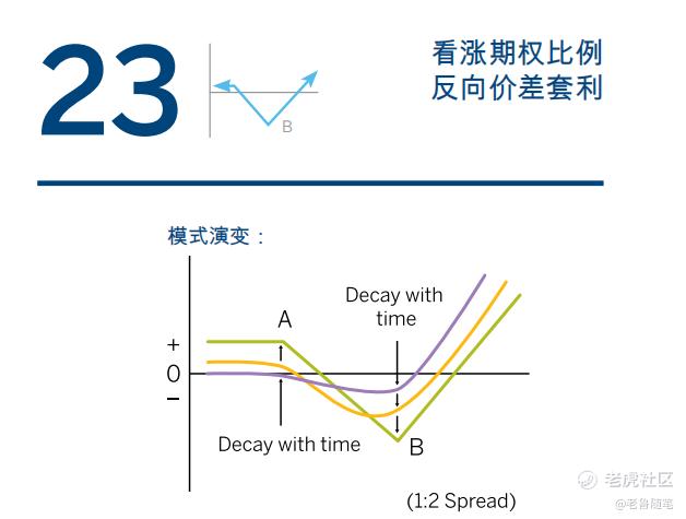 何时使用:通常在市场接近 A 点,使用者预期市场会小幅至温和上扬,但预计会出现潜在抛售时入市。最常见的期权价差套利之一,由于具有上涨风险,比例极少超过 1:3 (两个过量卖空)。
