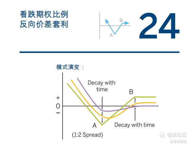 获利特点:获利有限,如果市场等于或低于敲定价格 A,到期时获利达到最大。如果使用看跌期权对看跌期权型 (最常见),收支平衡点为 B 减去价差套利净成本。如果使用看涨期权对看涨期权型,则收支平衡点为 A 加上 净权利金收入。
