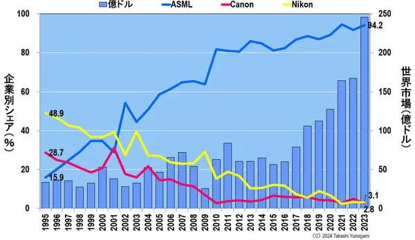 然而,荷兰的ASML在1995年拥有15.9%的市场份额,此后迅速扩大了市场份额,在2002年超过了尼康和佳能,在2010年超过了80%,在2021年达到了90%。2023年,ASML拥有94.2%的市场份额,而尼康和佳能将分别拥有3.1%和2.8%的份额。
