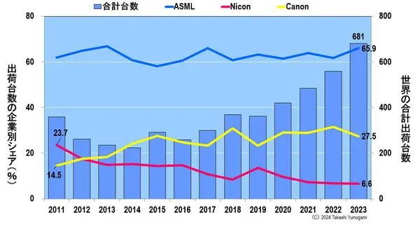 ASML的出货份额一直保持在65%左右。另一方面,佳能的市场份额从2011年的11.4%逐渐增加到2015年以来的近30%,尼康2011年23.7%的市场份额在2023年逐渐下降到6.6%。