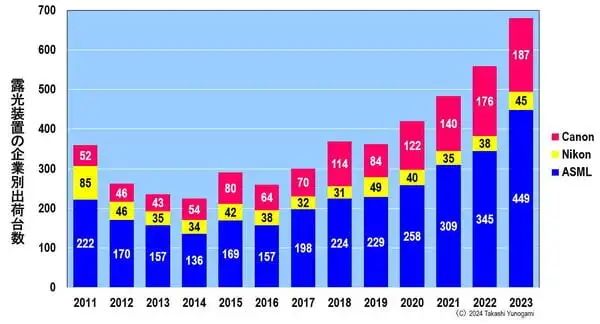 然而,从 2015 年到 2023 年,ASML 和佳能的出货量显着增加。ASML从169台增加到449台,佳能从80台增加到187台。而尼康的增幅不大,从 42 台增至 45 台。
