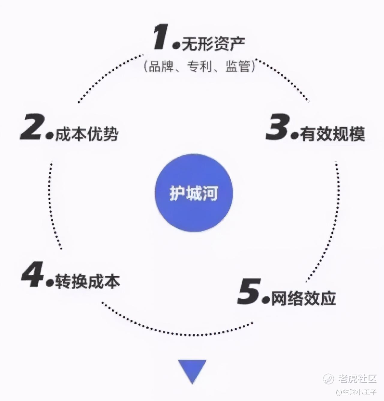巴菲特在2000年股东大会上把竞争优势比喻为护城河:“我们喜欢持有这样的城堡:有很宽的护城河,河里游满了很多鲨鱼和鳄鱼,足以抵挡外来的入侵者。我们认为这些企业城堡的护城河是不可能跨越的,并且每一年我们都让管理者进一步加宽这些企业的护城河,即使这样做不能提高当年的盈利。我们认为我们所拥有的企业都有着又大又宽的护城河。”