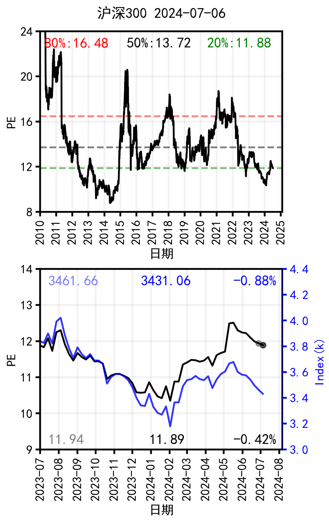 上周PE为11.94,本周为11.89,变化-0.42%。