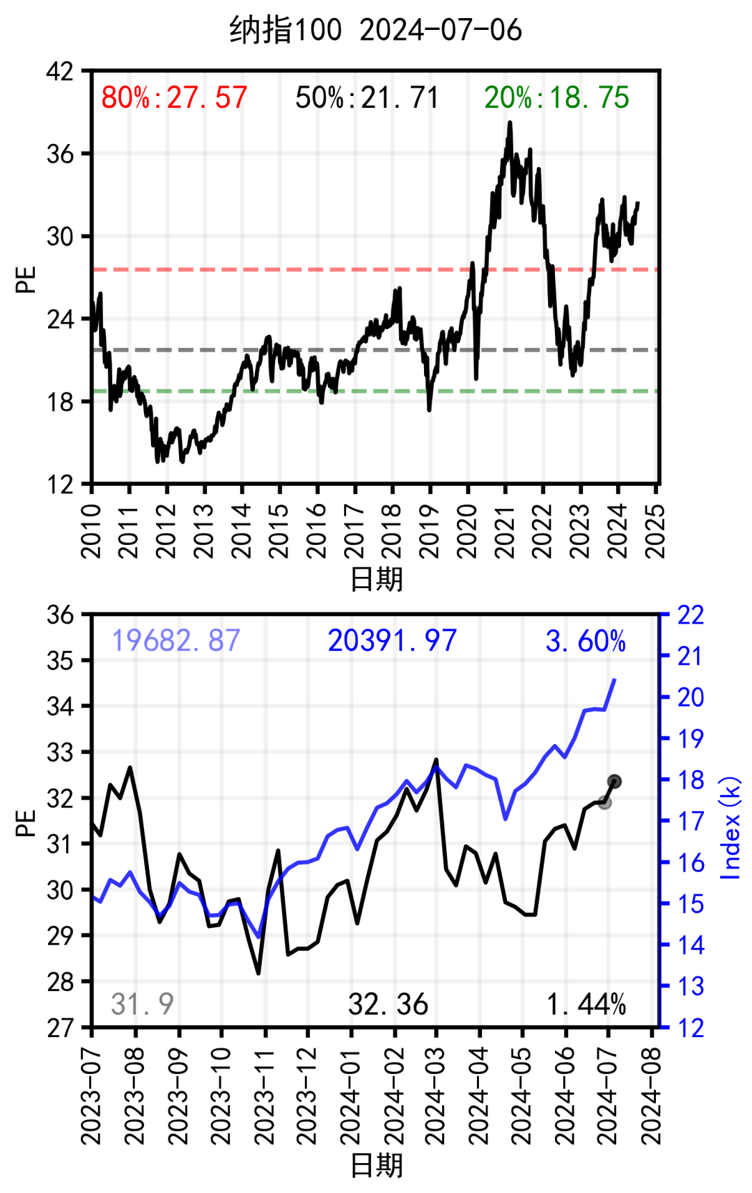 上周PE为31.90,本周为32.36,变化1.44%。