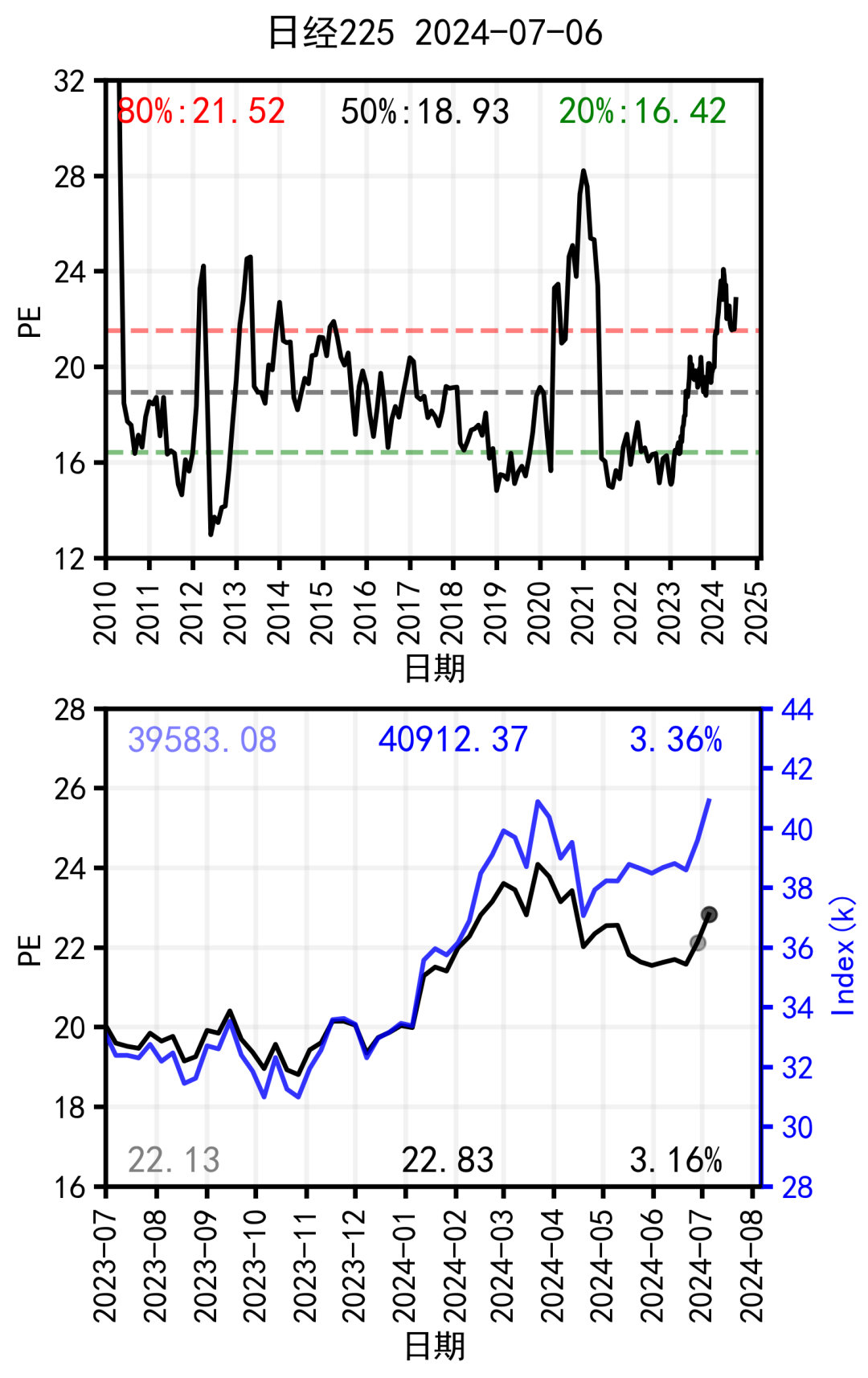 本周日经225指数大涨,PE也同步大涨。