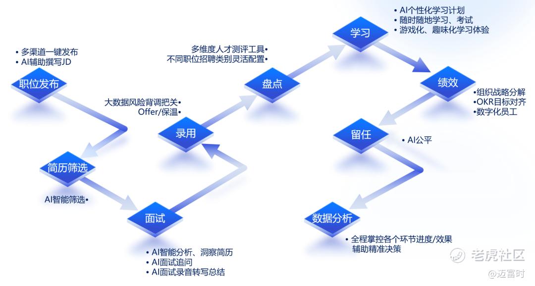 在招聘环节,AI可以根据实际招聘数据优化职位画像,针对教育、技能、经验等方面智能评估进行人岗匹配,提高招聘效率。AI还可以分析简历中的风险点,提示HR可能出现的问题,减少招聘风险。