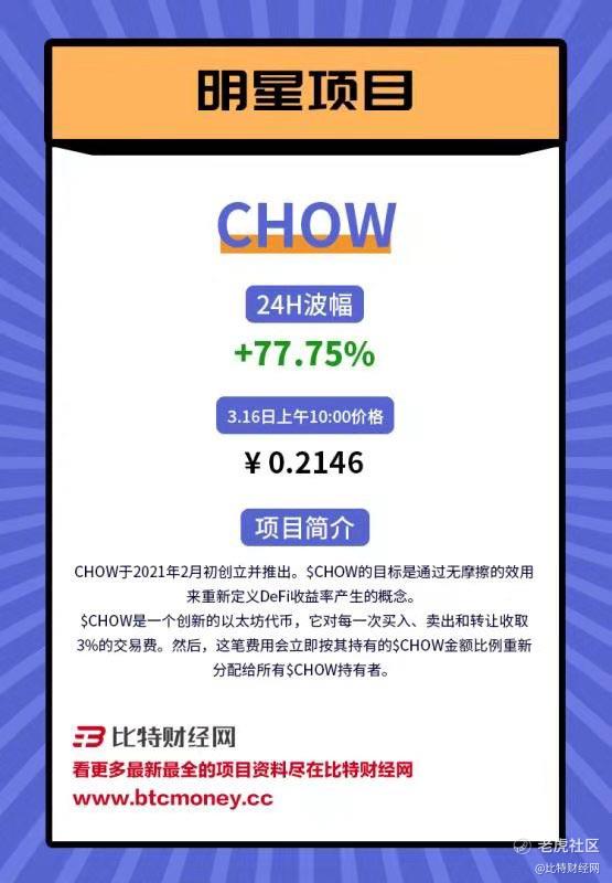 CHOW是一个创新的以太坊代币,它对每一次买入,卖出和转让收取3%的交易费。