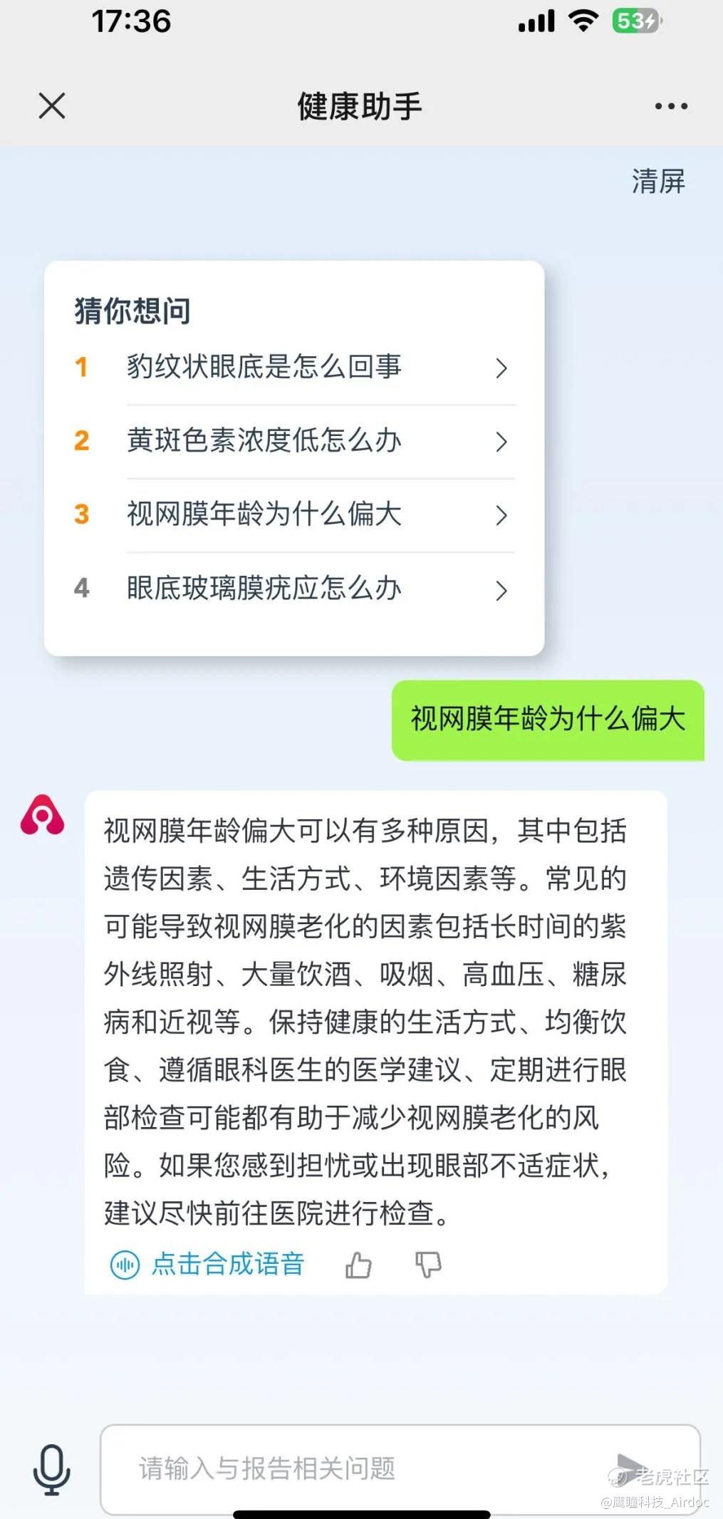 用户关注公众号后,即可方便通过文本和语音的方式与大模型交互,目前已经应用于天津鹰瞳综合门诊部“健康助手”部分。在线下门诊、视光中心、以及家庭环境中,万语大模型的交互可以赋能医学诊断和决策。