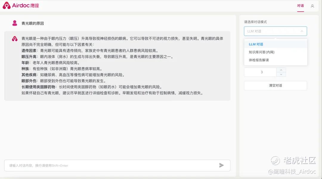 支持大模型问答,同时支持配合知识库+ 大模型问答方式。目前浏览器端口的万语医疗大模型主要应用于医学决策和知识普及,问答内容主要聚焦在“医学解决方案”,除了眼科以外,其他健康相关的问题,如内科、外科、皮肤科、妇科等,都可以进行回答。