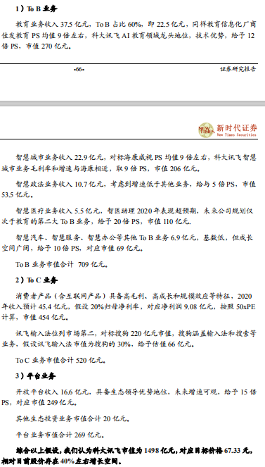 讯飞按2020年预计营收算是9倍PS,与美股nuance相当,但低于即将上市的AI公司10-20倍ps。笔者认为,由于讯飞处在行业商业化落地初期,理论上空间无限,此时定性远比定价重要。附新时代证券所做估值仅供参考。