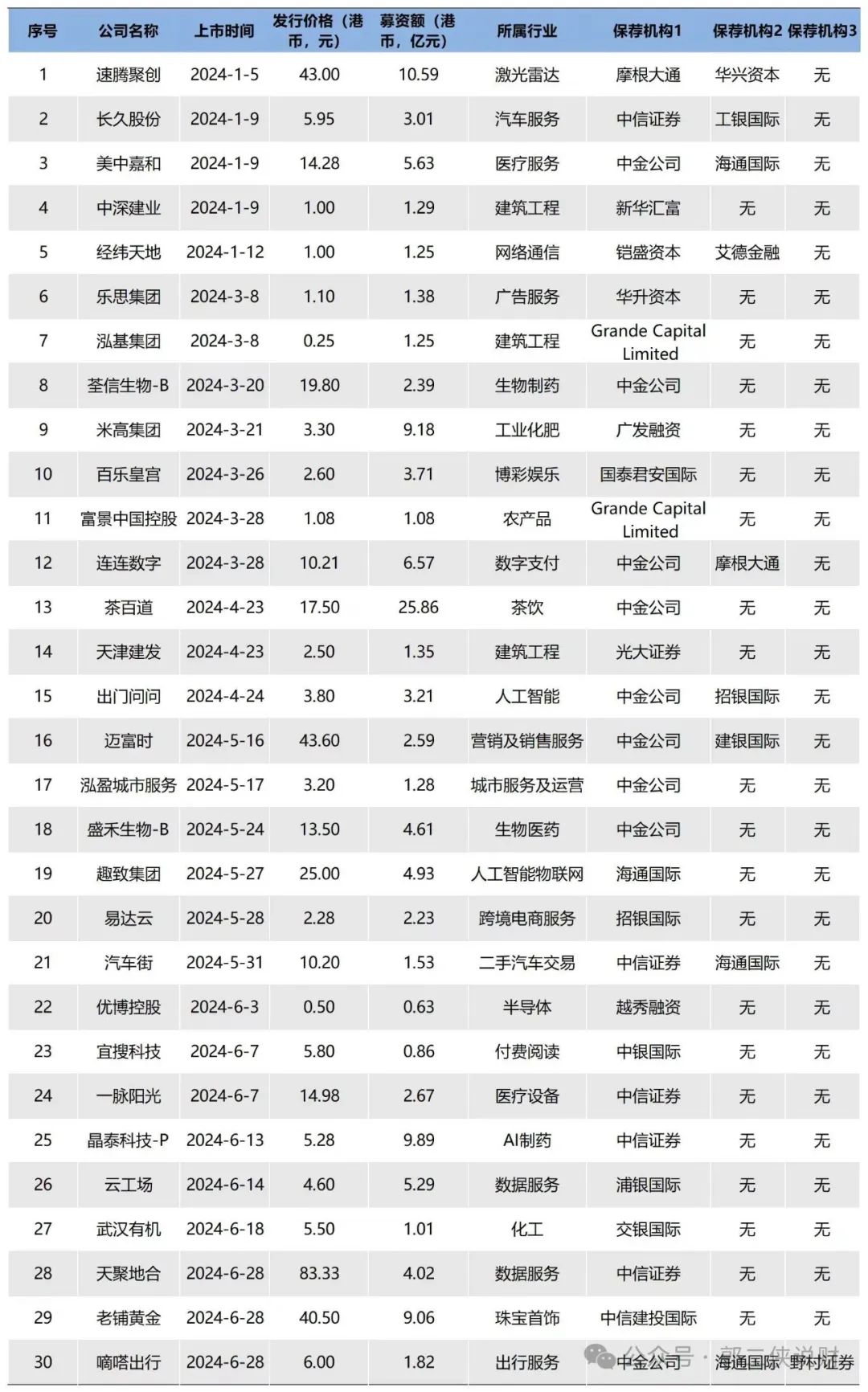 2024年上半年,港股共30家公司成功上市,一共募资132亿港元,较2023年的179亿减少47亿,同比下降26%。主要原因是目前市场疲弱,大部分赴港上市公司选择缩减募资规模以降低发行难度,大中型IPO的募资规模减少。
