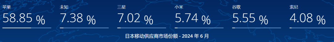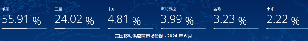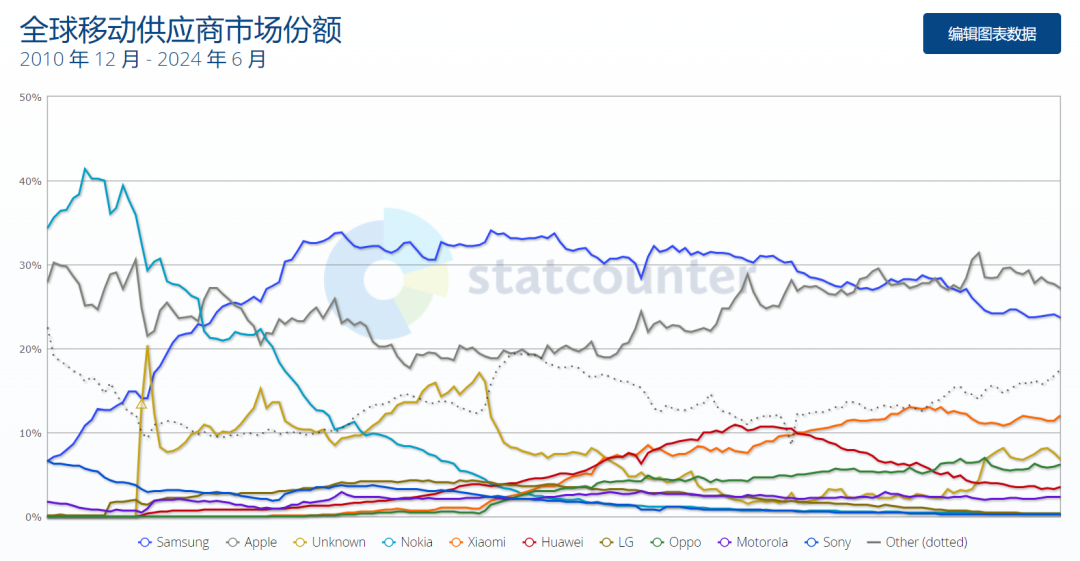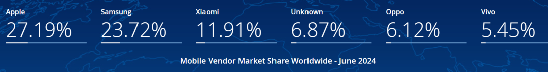 2024年6月,苹果仍是全球第一,市场份额为27.19%;三星虽屈居第二,但全球份额还略有上升,为23.72%。