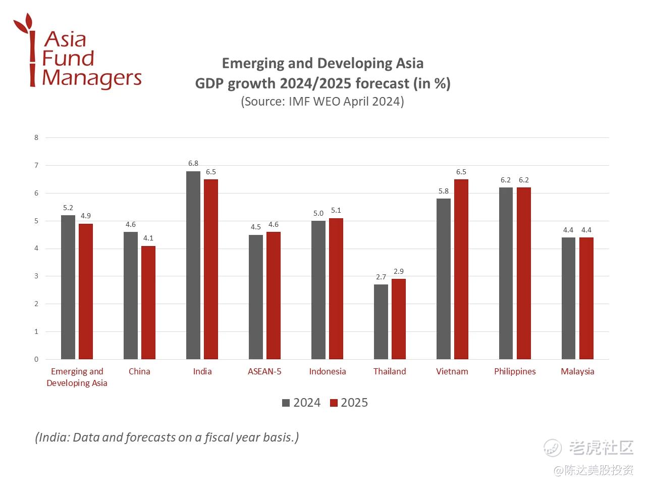 从经济进一步发展得态势而言,根据国际货币基金组织(IMF)最新发布的《世界经济展望》,亚洲是全球经济增长的主要推动力——预计 2024 年的地区GDP增长率达到 4.5%,比去年10月的预测提高了 0.3 个百分点。2024年亚洲经济,占今年全球经济增长的超过 60%(前面说了,经济总体量大约是40%)。IMF也 预计 2025 年的经济增长将到达4.3%。以下是IMF对亚洲各国GDP增长2024/2025的预测:
