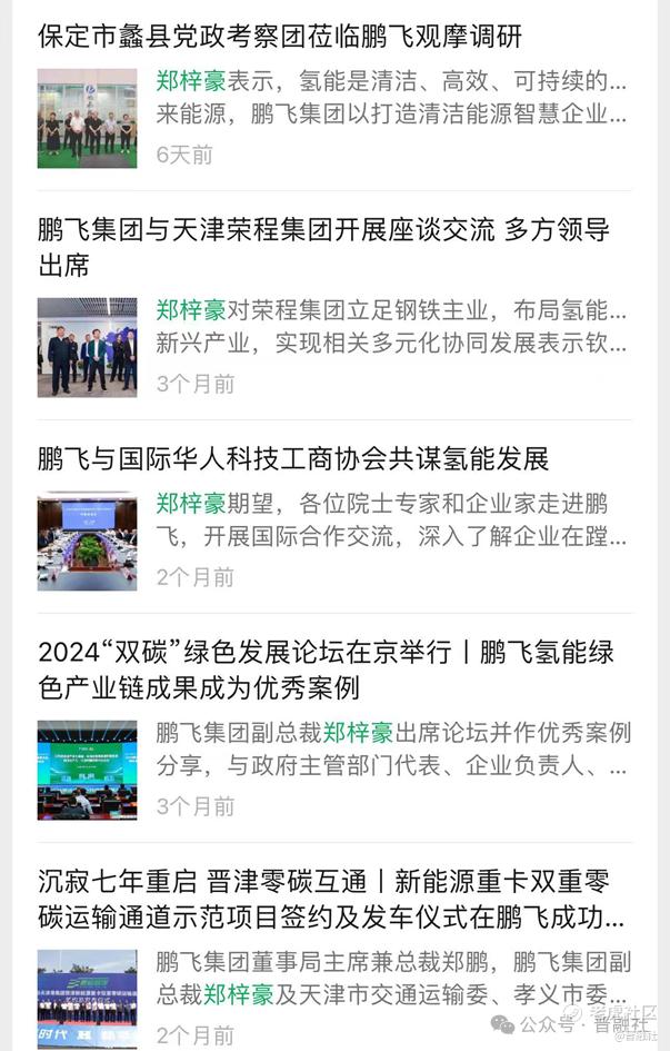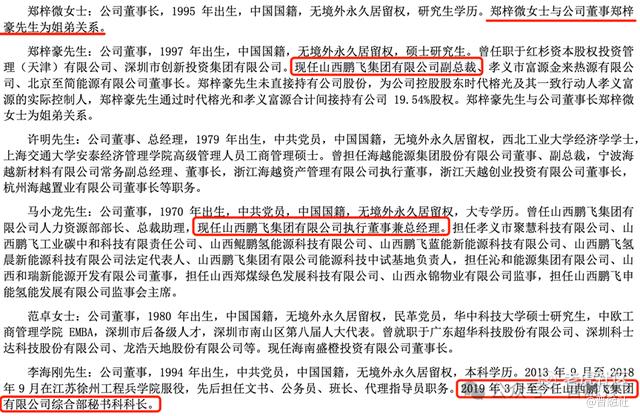 赫美集团2023年报显示,郑梓豪现任山西鹏飞集团有限公司副总裁、孝义市富源金来热源有限公司、北京至简能源有限公司董事长,其频繁代表鹏飞集团出席活动、公开发言。