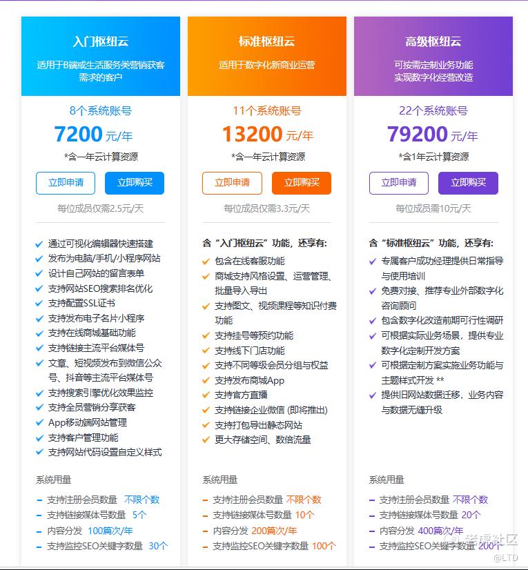 SaaS系统的定价和版本区隔,通常基于成员数量、CMS存储数据量、收集信息的用量以及功能迭代等因素。对于小客户来说,官微云(网站云)是一个不错的起点,因为其市场投入有限,而且功能需求相对简单。而对于有一定规模的企业来说,枢纽云无疑是更好的选择。企业自身一定比服务商更清楚自己的用户群体是谁,怎么搞流量,所以服务商更多的是提供技术支持 ,帮助企业更好地利用资源,推动数据的有效流动。