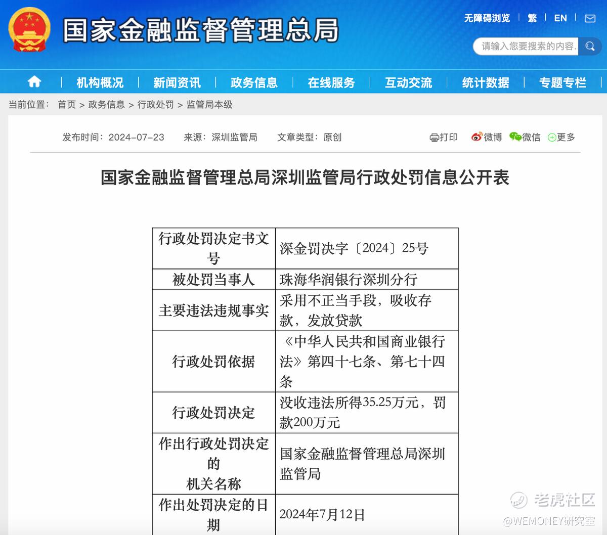 7月23日,国家金融监督管理总局深圳监管局行政处罚信息公开表显示,珠海华润银行深圳分行因采用不正当手段,吸收存款,发放贷款,被处以没收违法所得35.25万元,罚款200万元。
