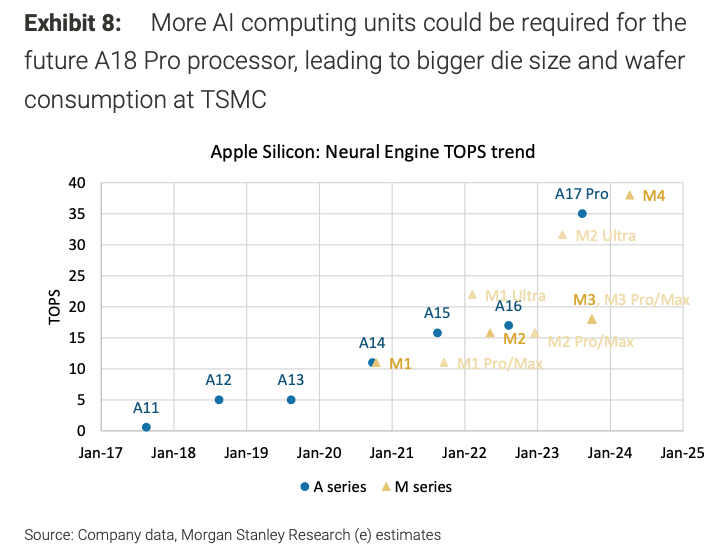 看近几年的数据,一般来说,手机芯片每年更新一代,PC芯片每两年更新一代,每一代的成本提高~10%:如果是制程不变的话,芯片面积会增加10-20%;如果制程升级,芯片面积会减少10-20%,但是由于制程升级导致wafer成本提高了30-40%,实际上芯片价格还是会提高10-20%。在Edge AI的浪潮下,NPU的算力需求急速提高,需要更多的芯片面积,甚至有可能出现制程升级同时芯片面积不下降的情况,比如TSM在财报会上就说AI芯片的面积增加了5-10%,尽管今年是高通、联发科从4nm升级到3nm。