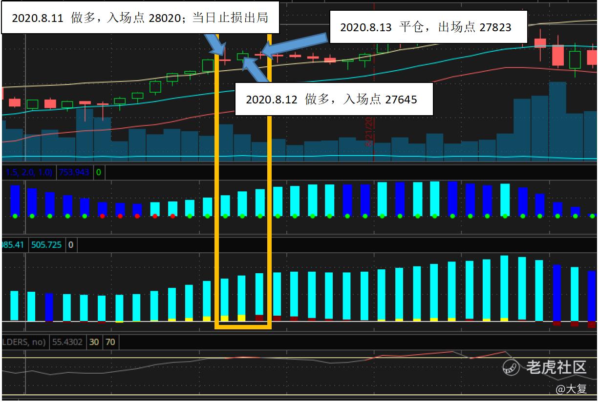 操作:由于各种原因,没有每日盯盘。8.11当天盯盘,发现挤牌信号已经出现几天,而且价格已经超过肯特钠上通道。理论上,此时已经错过了最佳入场时机,一是因为挤牌指标已经出现四天,二是价格已经到达肯特钠上通道,种种迹象表明本次上涨已经接近尾声。但是,此刻赌徒心理做崇,想搏一把......以市价入场做多,止损设置1个ATR(466个点)。订单成交,成交点位28020。由于上涨乏力,日内波动较大,同时入场价格较高,当天点位下降到止损点以下时被止损出局。此刻深深懊悔挤牌指示信号刚刚出现时没有入场,同时生怕错过赚钱机会,又心疼损失的几百刀,急于挽回。在种种感性因素驱使下,全然抛弃理性约束,在8.12再次以市价入场做多。入场点位27645,止损点依然是1个ATR。入场之后凭着感觉在8.13以27823平仓出场。赌赢了......获利90刀,算是弥补一些损失,但是完全没有交易准则......