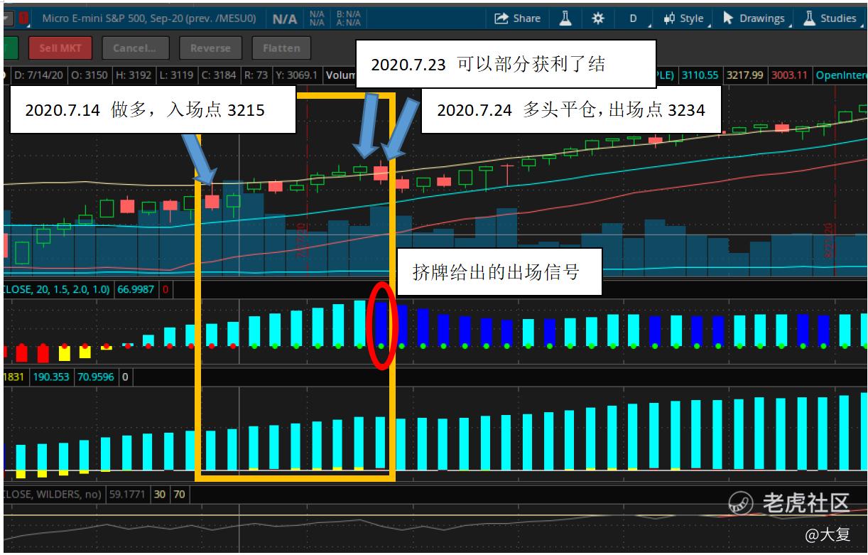 操作:第一次被止损后心有不甘,时刻注意挤牌指标变化。一连几天发现挤牌指标一直存在,终于在7.14这天再次出手,以市价入场做多。吸取上次被过早止损出局的教训,此次使用宽止损即1.5倍ATR。订单成交,成交点位3215。订单成交后,连续几天挤牌指标一直有效。可以看到,指数整体上扬,并穿过肯特钠通道的上沿线(黄色框图内)。这期间,本人没有获利了结出场,直至7.24挤牌指标给出出场信号(红色圆圈),本人以市价结束多头,出场点位3234。奈何本金2800$太少,出于风险控制考虑,没有购买多手合约。如有多手合约,可在价格上升到肯特钠通道上沿,获利了结一半仓位,落袋为安。剩下的一半仓位博取更高收益。与前一天最高点位3271相比,利润少了一大截,虽有遗憾但不后悔。既然是技术型交易,就严格按照指标操作。