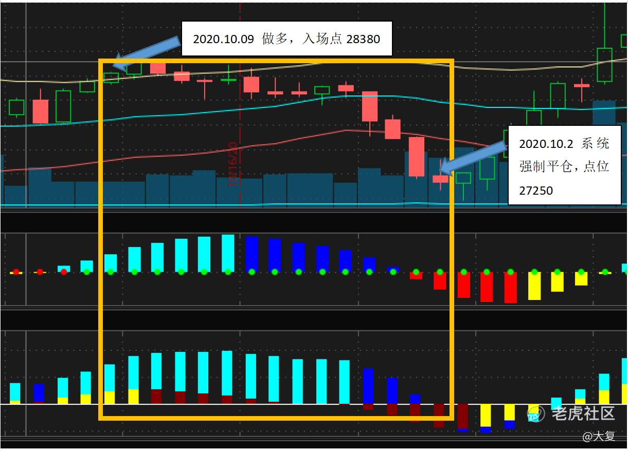 操作:度过烦躁闷热的夏天,心态似乎也平和很多。这期间一直没有交易,一是因为没有合适的交易指标出现,二是抓紧时间看书,尽快丰富知识体系。国庆节期间没有盯盘,等盯盘后发现挤牌指标再次出现,但是错过了最佳入场点10.6,10.9以市价入场做多,入场点28380,但是没有设置止损,这也是这次交易失败的一个原因,但不是主要原因。10.10和10.11是周末,美股休市。从10.12早上家里萌娃出生开始到10.29系统强制平仓发消息(平仓点位27250),这个头寸就被彻底遗忘、抛弃......期间挤牌指标信号消失、价格回到13日均线直至价格穿过肯特钠通道下边缘线。