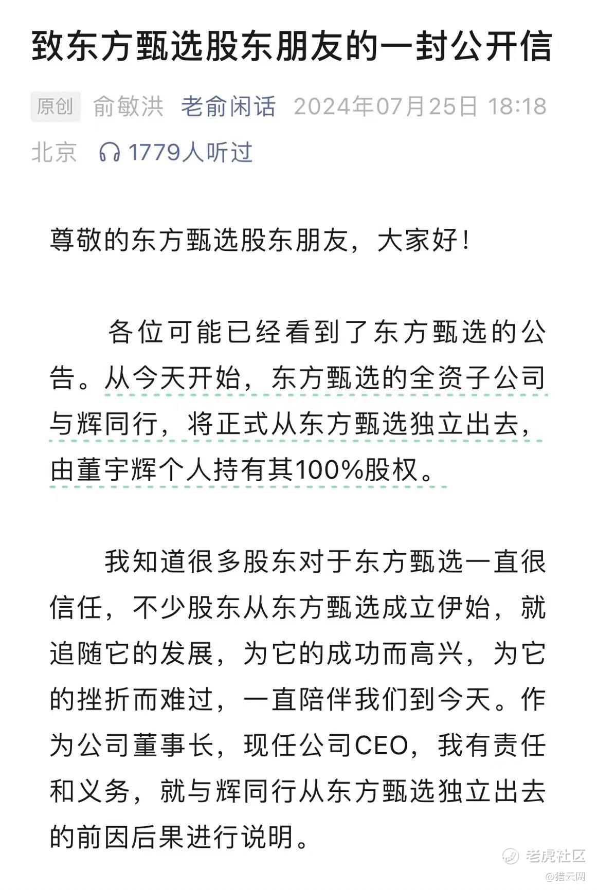“为了确保与辉同行有更好的发展舞台,避免业务冲突和舆论纠葛,我们俩经过反复磋商,最后决定到财年结束(5月31日)之后,我去请求董事会同意,把与辉同行的股份100%转让给宇辉本人。”